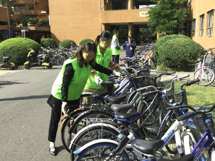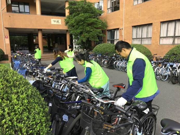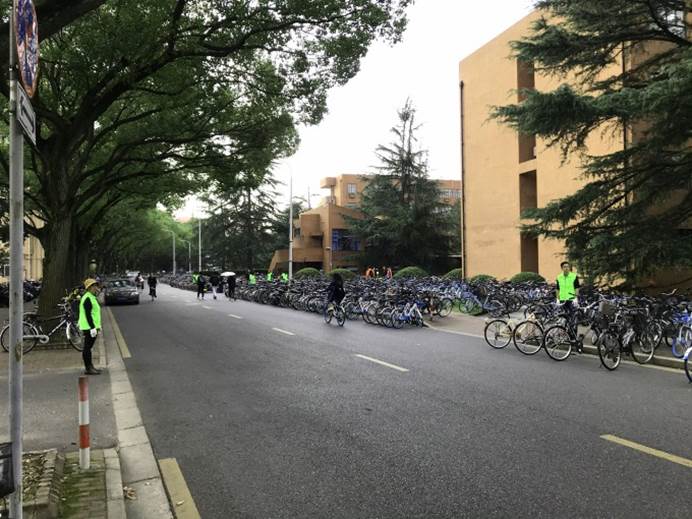 同志们了解到,此刻闵行校区西区上、中、下院附近区域停放的自行车约有3000辆之多,如果算上同学们重复进出该区域的自行车,日常每天需要规整摆放的自行车约有一万余辆次。尤其在集中上课时段,自行车短时间内大量涌入,自觉、整齐停放变得更加重要。